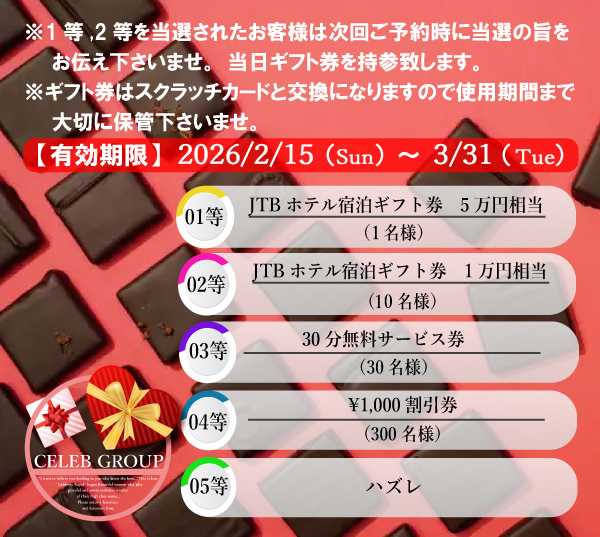 期間中にご利用頂きましたお客様全員に、その場で当たるバレンタインスクラッチカードを進呈させて頂きます。